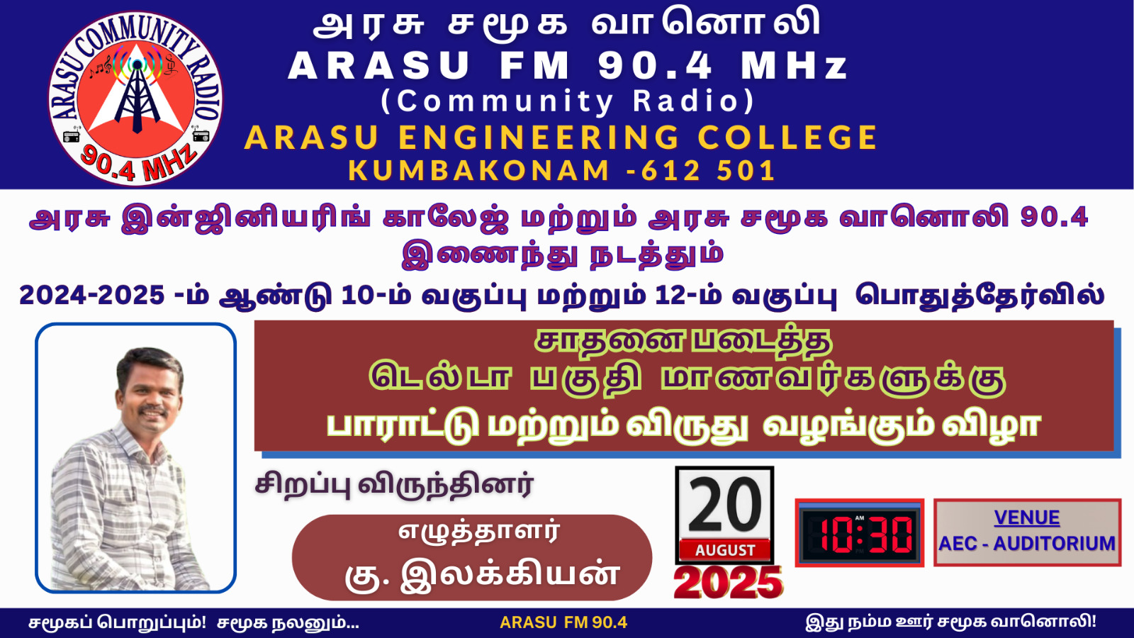 Arasu Engineering College and Arasu FM 90.4 jointly organizes “Delta Region (10th and 12th) Toppers Felicitation Ceremony – 2025” on 20.08.2025