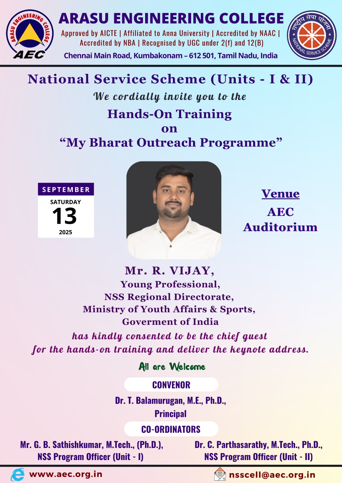 Arasu Engineering College NSS Unit I and Unit II Organises Hands on training on “My Bharath Outreach Programmee” on 13.09.2025