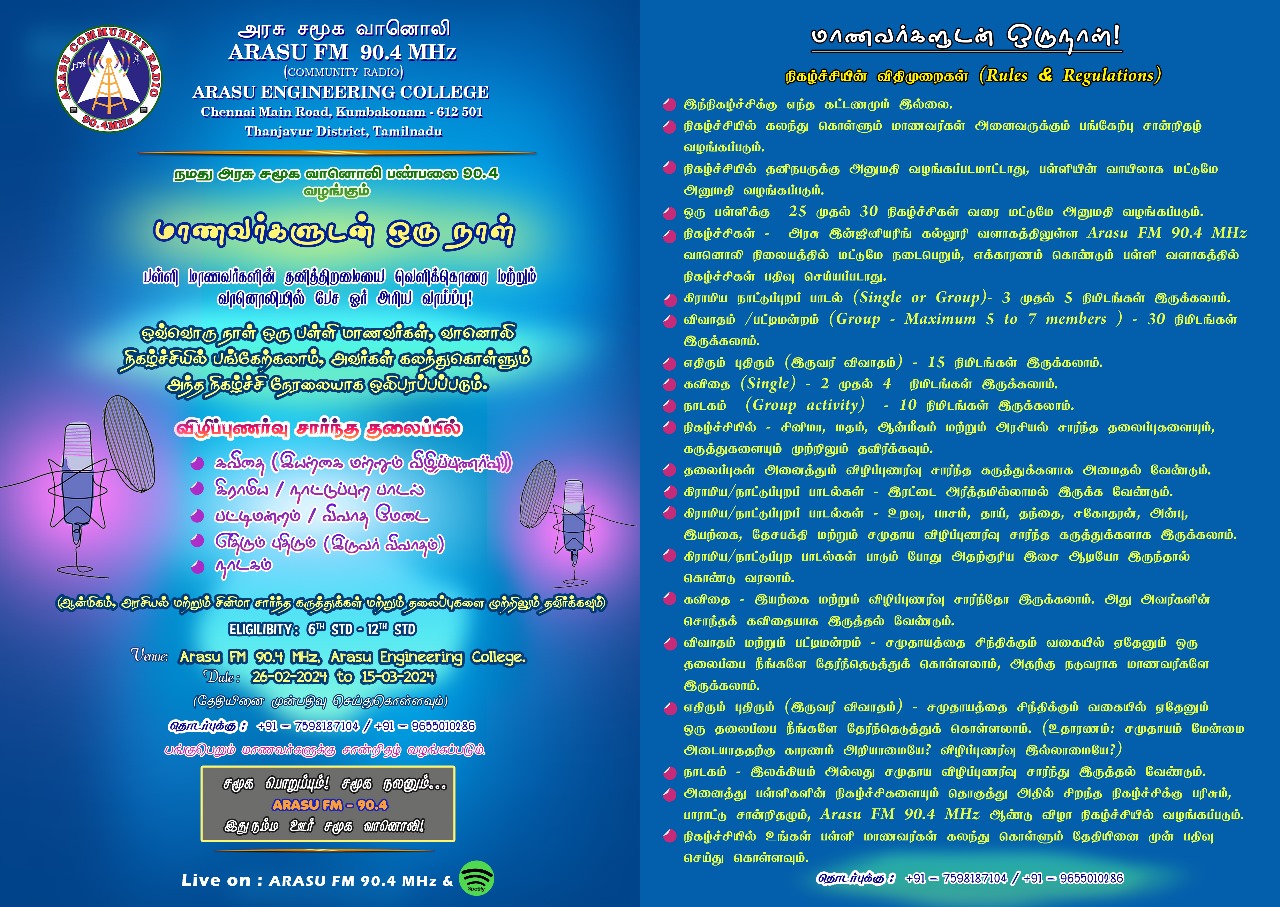 Arasu FM 90.4 MHZ organizes “மாணவர்களுடன் ஒரு நாள் ” from 26.02.24 to15.03.24
