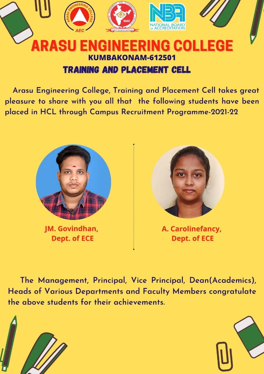 Arasu Engineering College, Training and Placement Cell takes great pleasure to share with you all that the following students have been placed in HCL through Campus Recruitment Programme 2021-22