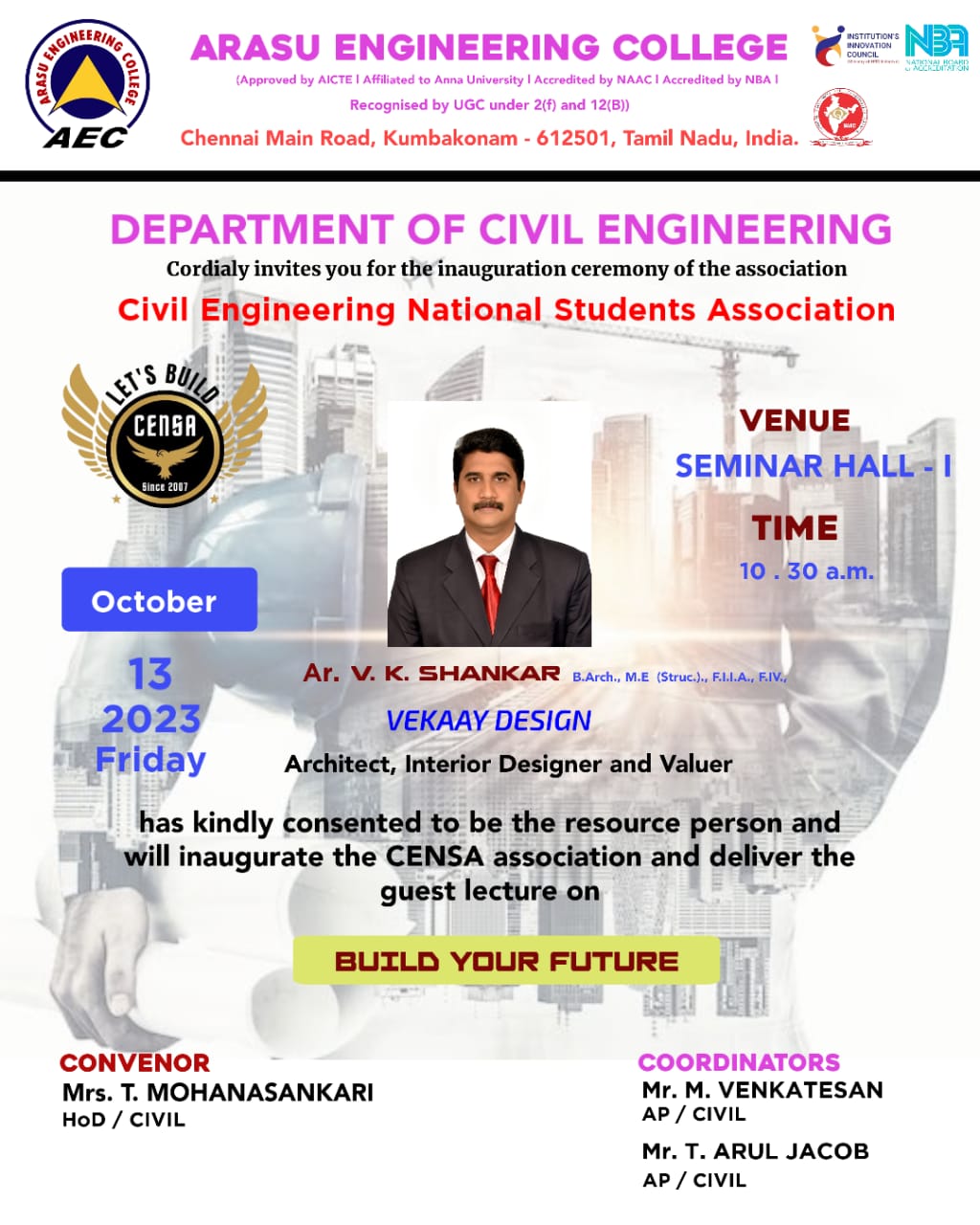 Department of civil organizes CENSA student association inauguration on 13 th October 2023 and deliver a lecture on “Build your Future”
