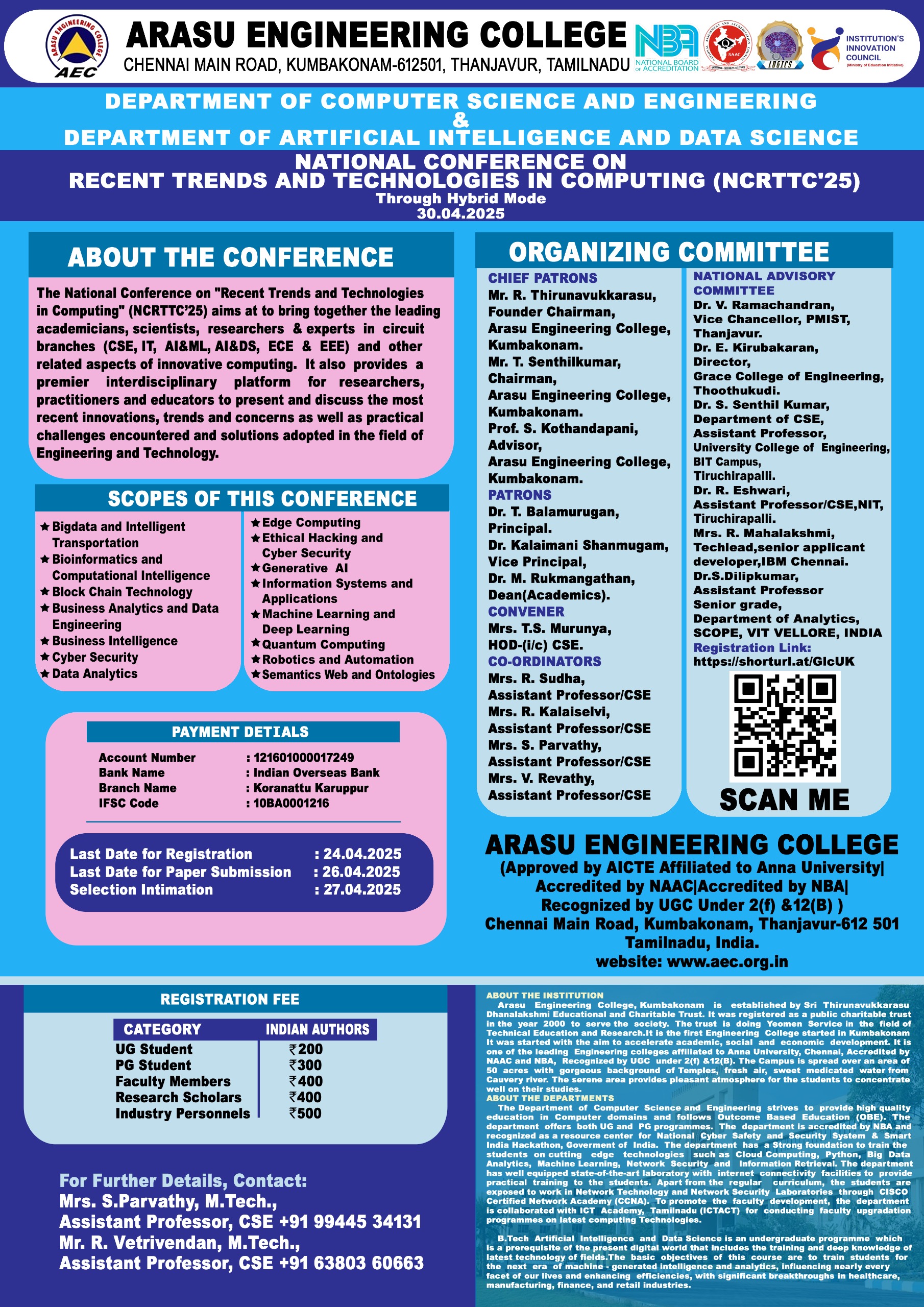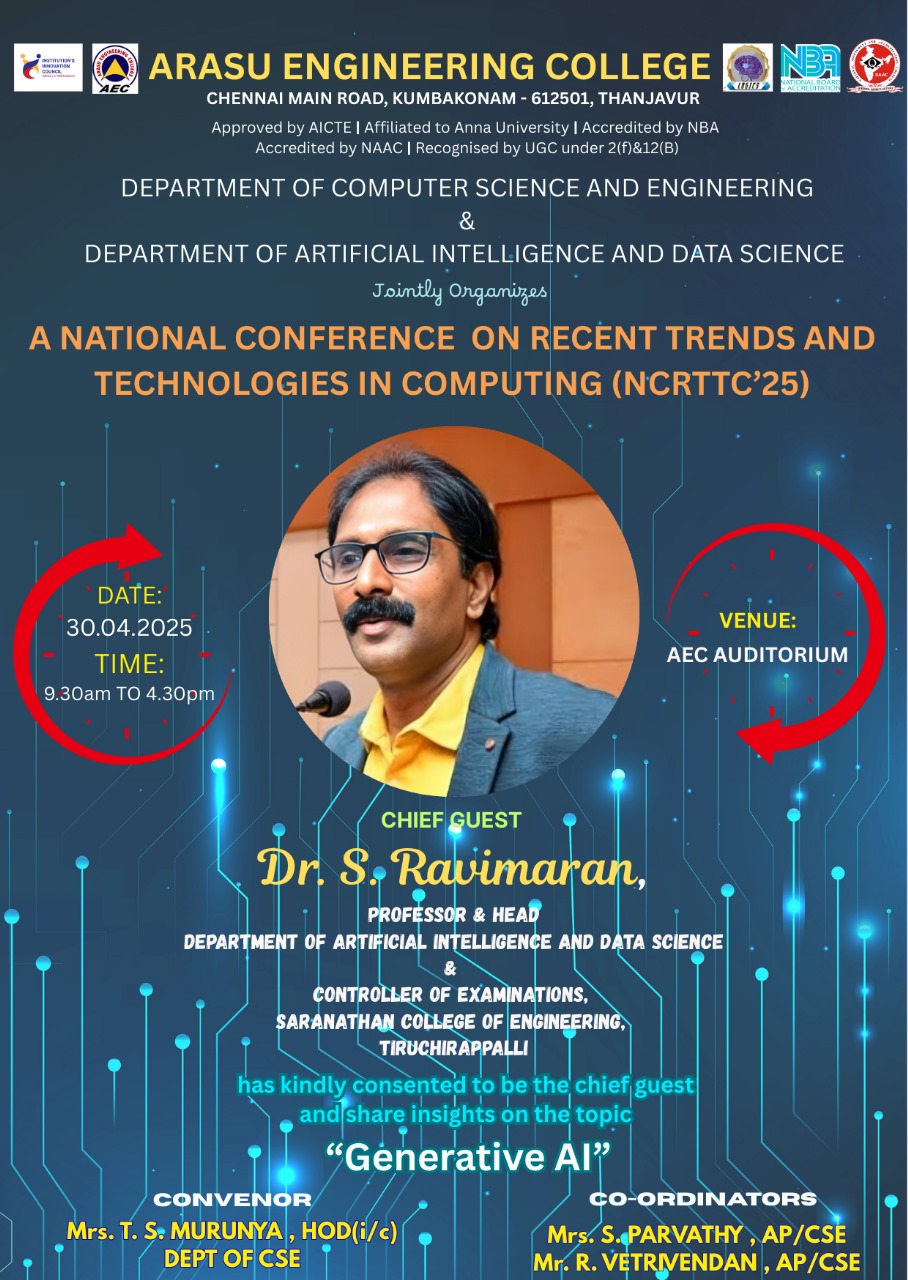 Department of Computer Science and Engineering and Department of Artificial Intelligence and Data Science jointly organizes “National Conference on Recent Trends and Technologies in Computing (NCRTTC’25) through Hybrid mode on 30.04.2025