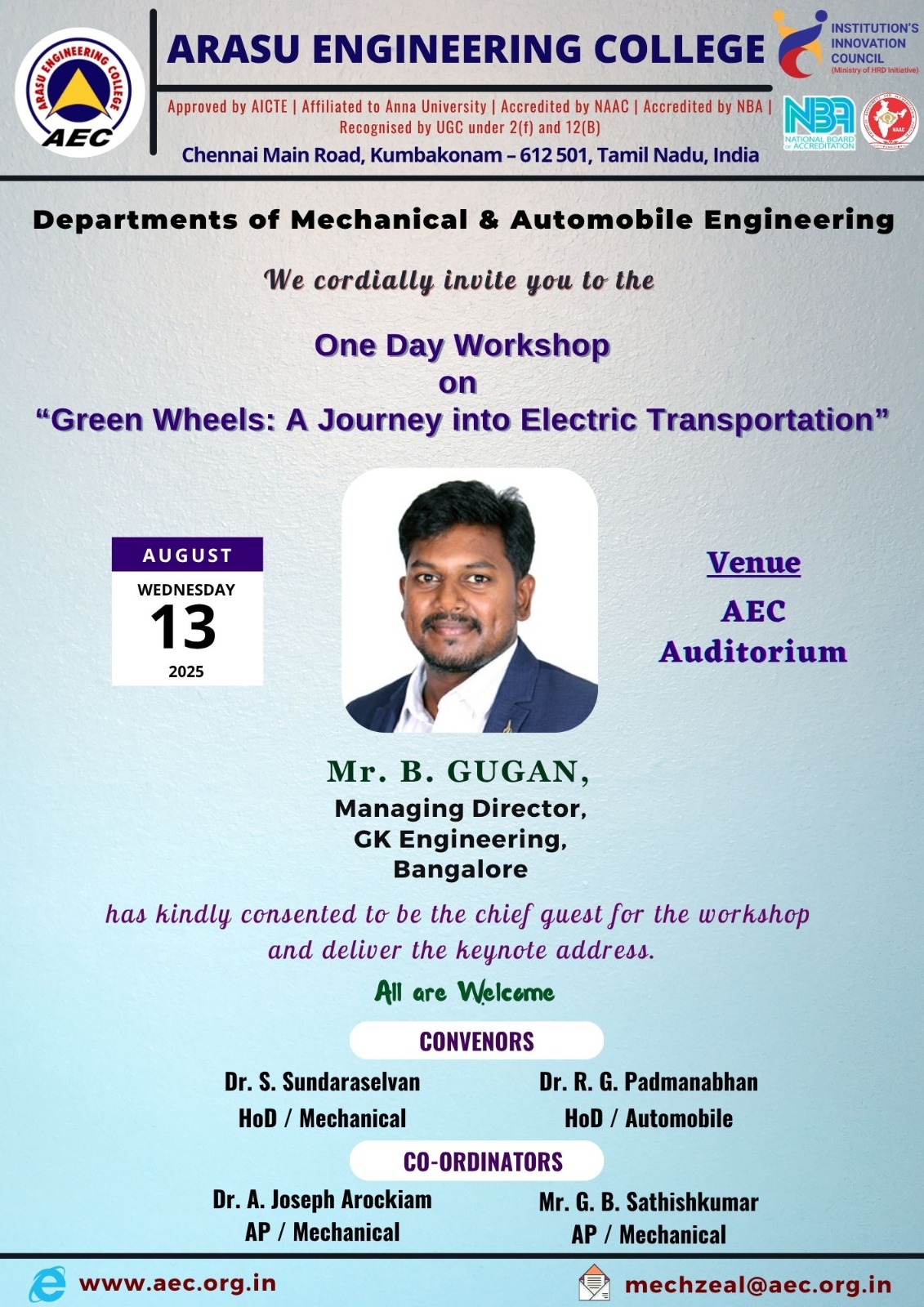 Departments of Mechanical Engineering and Automobile Engineering organizes one day workshop on ” Green Wheels : A Journey into Electric Transportation ” on 13.08.25