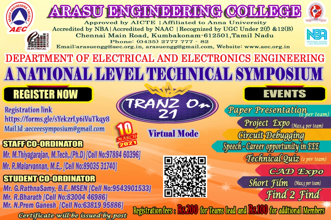 “A National Level Technical Symposium (Tranz on 21) ” organized by Department of Electrical and Electronics Engineering on 10.03.2021