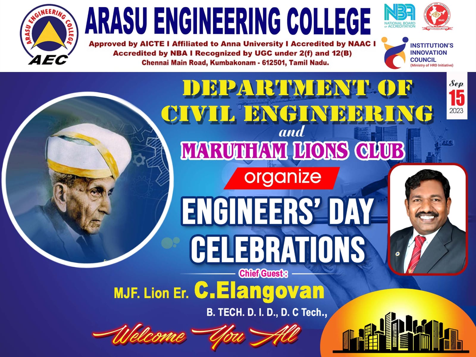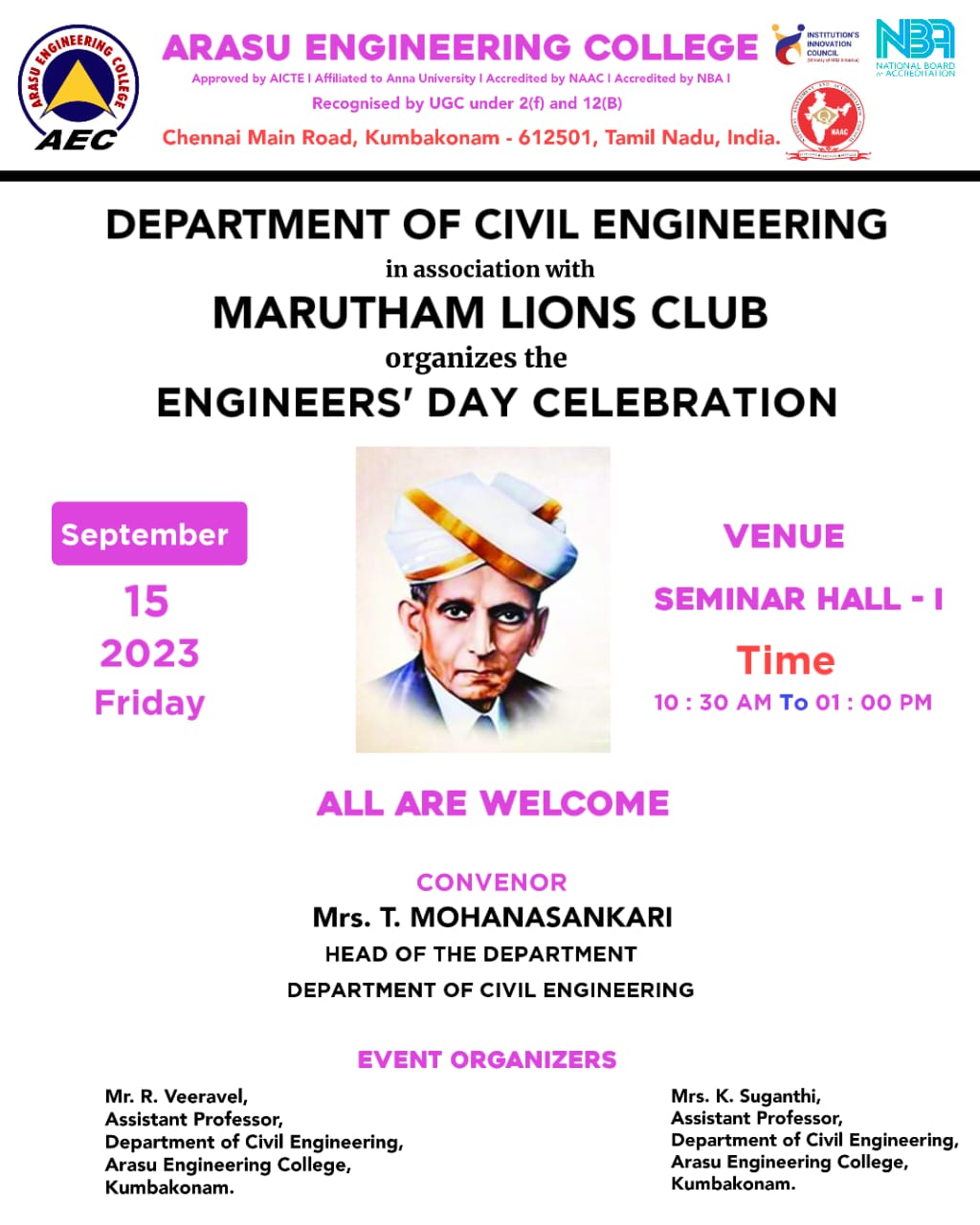 Department of Civil Engineering in association with Marutham Lions Club organizes the Engineer’s day Celebration on September 15, 2023