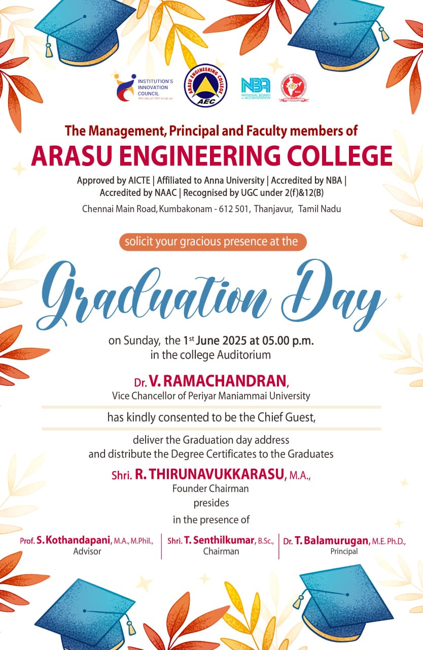 Arasu Engineering College organizes Graduation Day on June 01,2025 at 5.00 p.m