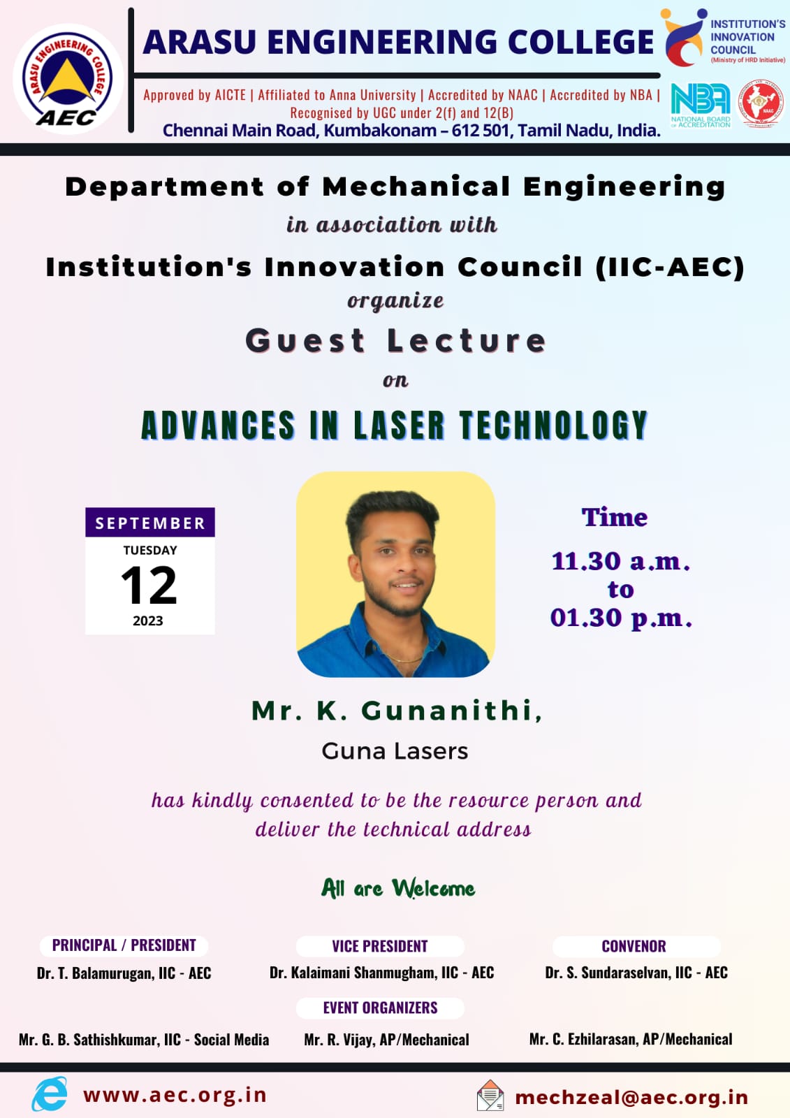 Department of Mechanical Engineering in association with Institution’s Innovation Council (IIC-AEC) organize Guest Lecture on Advances in Laser Technology