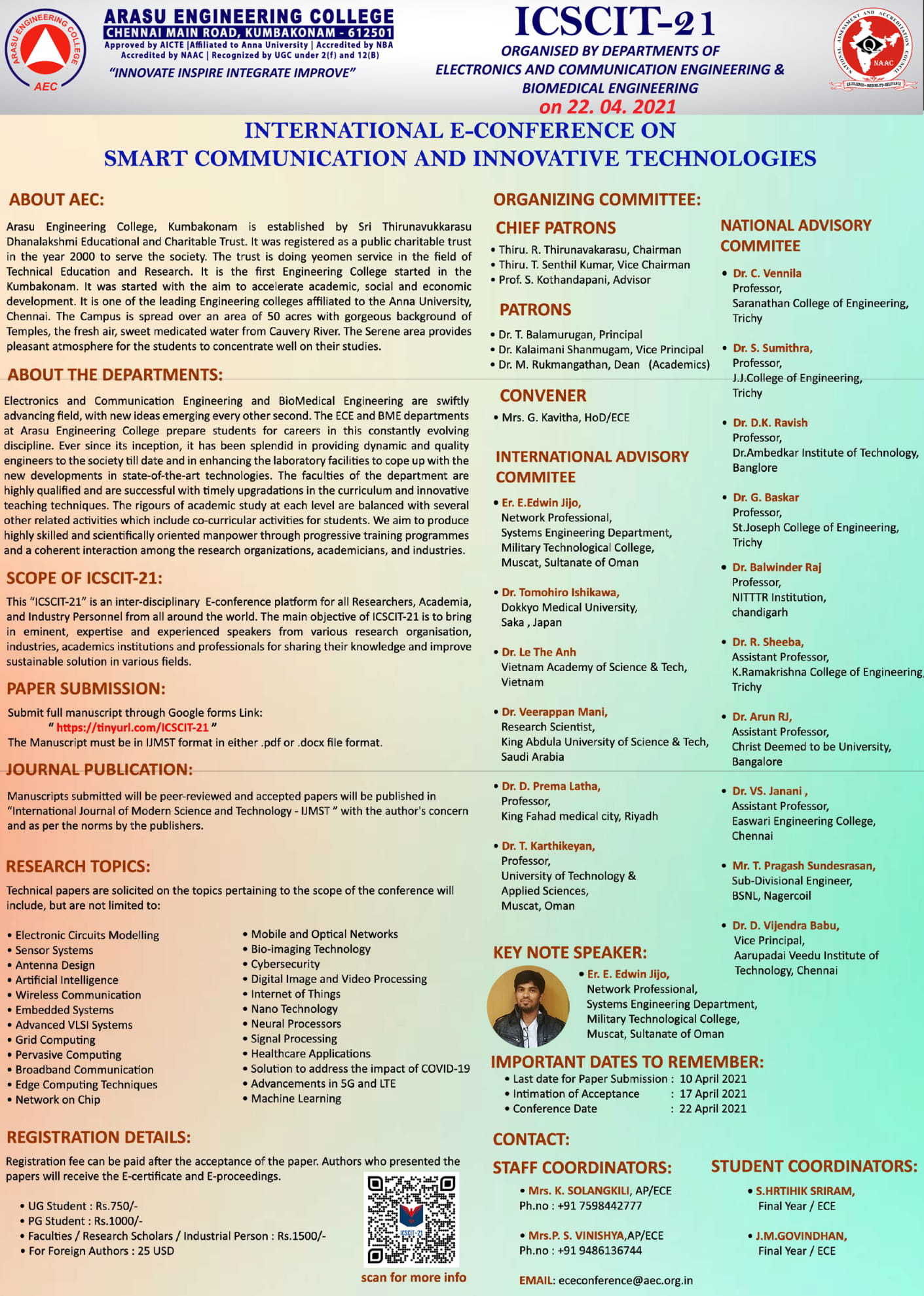 Departments of Electronics and Communication Engineering & Bio-Medical Engineering Organize “INTERNATIONAL E-CONFERENCE ON SMART COMMUNICATION AND INNOVATIVE TECHNOLOGIES – ICSCIT’21 ” on 22nd April 2021 through online mode.