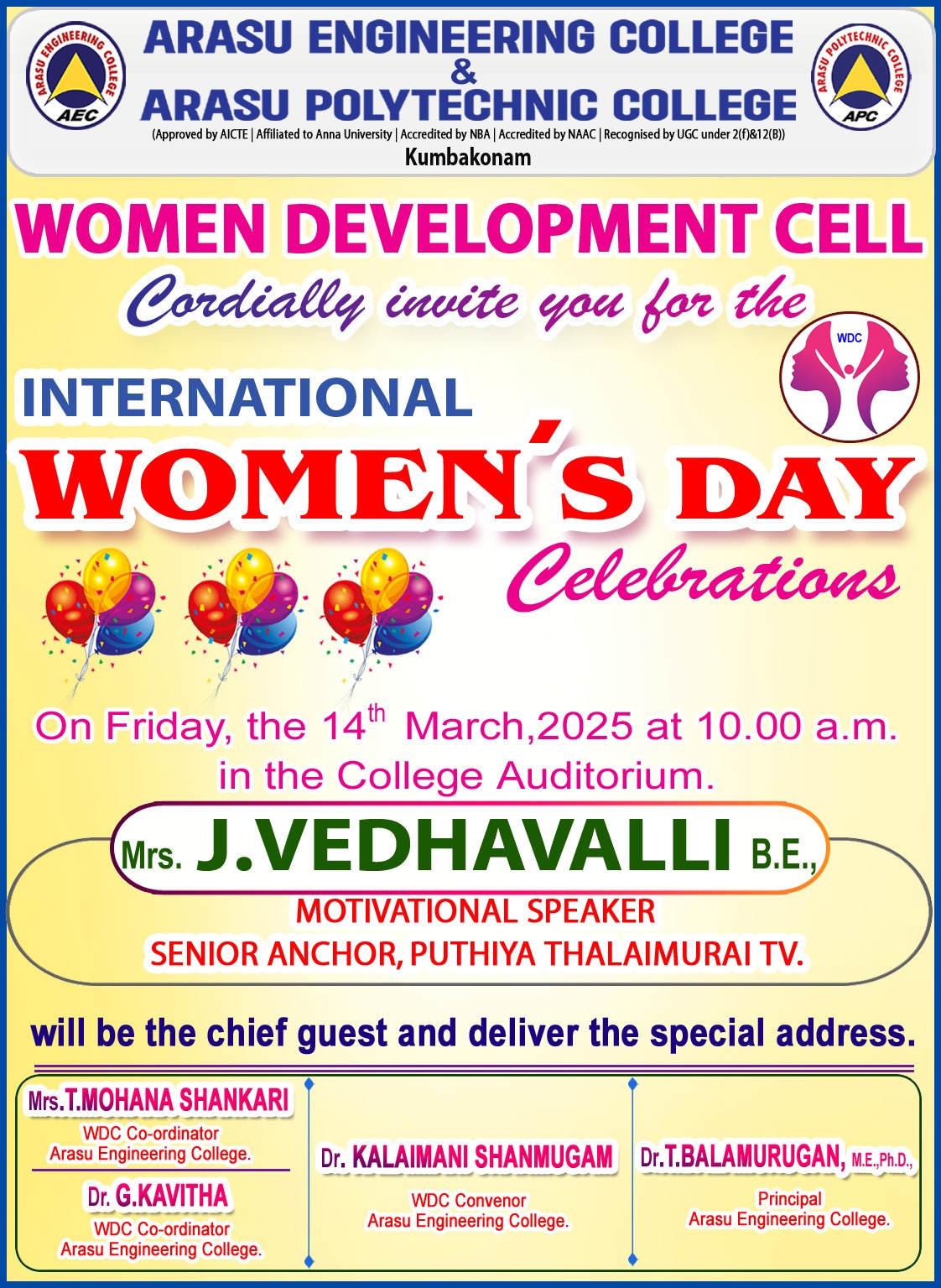 Arasu Engineering College and Arasu Polytechnic College organizes “International Women’s day Celebrations” on 14.03.25 at AEC Auditorium