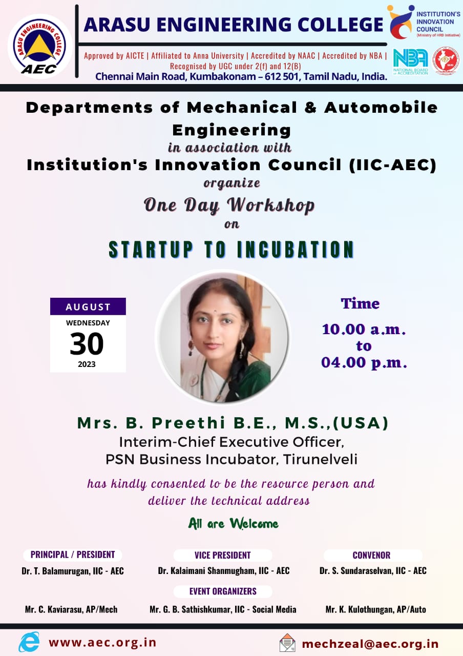 Departments of Mechanical & Automobile Engineering in association with Institution’s Innovation Council (IIC-AEC) organize One day workshop on “Startup to Incubation” at 30th August 2023
