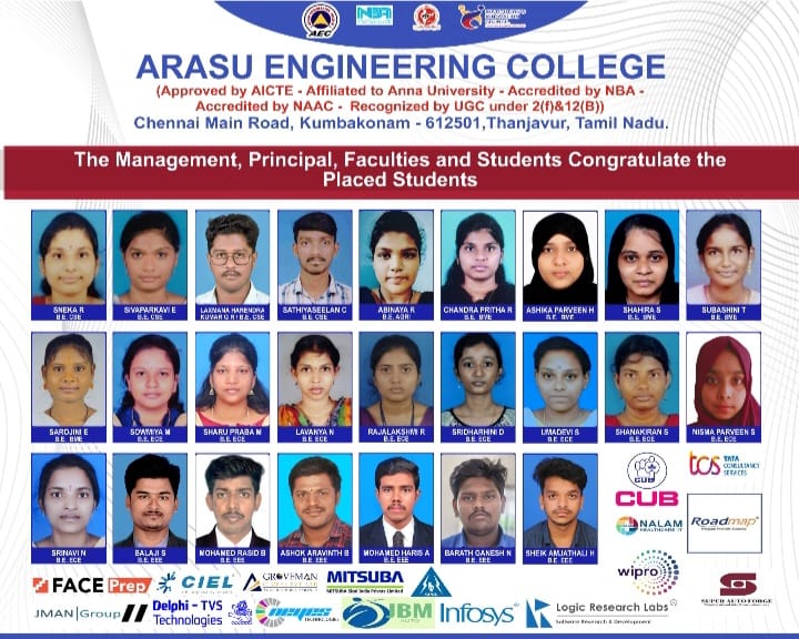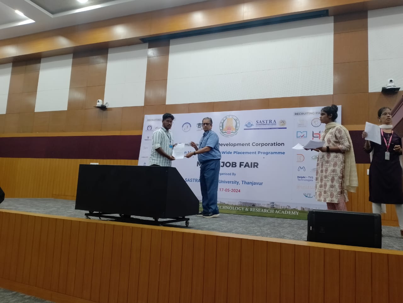 In the academic Year 2023-2024, our college final year students have attended interviews at various companies through Placement drive and achieved. Apart from this, through Naan Mudhalvan they have attended drive in SASTRA College @ Thanjavur and Job Fair at our Campus, Kumbakonam. In those drives, students from in and around Thanjavur Engineering colleges participated in nearly 20 companies in Thanjavur (approx. 20 colleges) and 15 companies (approx. 10 colleges) in our campus. Most of the students were selected and got their offer letters.