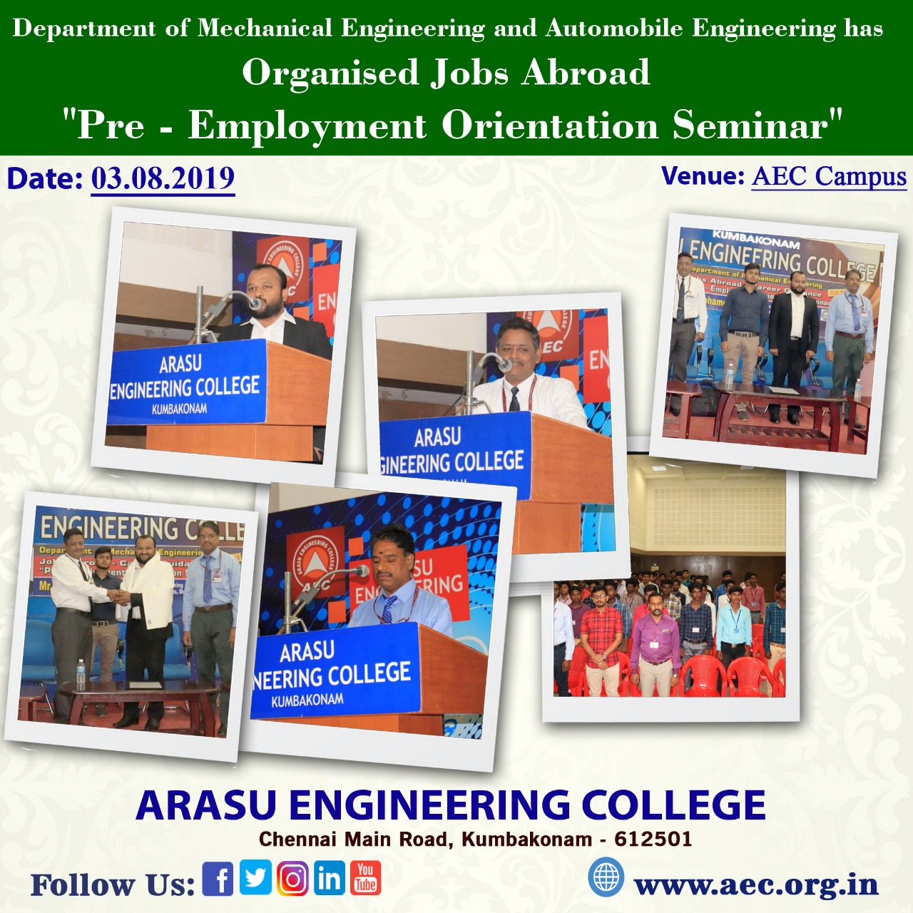 Special Lecture onJobs Abroad – Career Guidance “Pre – Employment Orientation Seminar” by Mr. Mohamed Ali – Head of inspection & Training URS Certification Services, Dubai – UAE