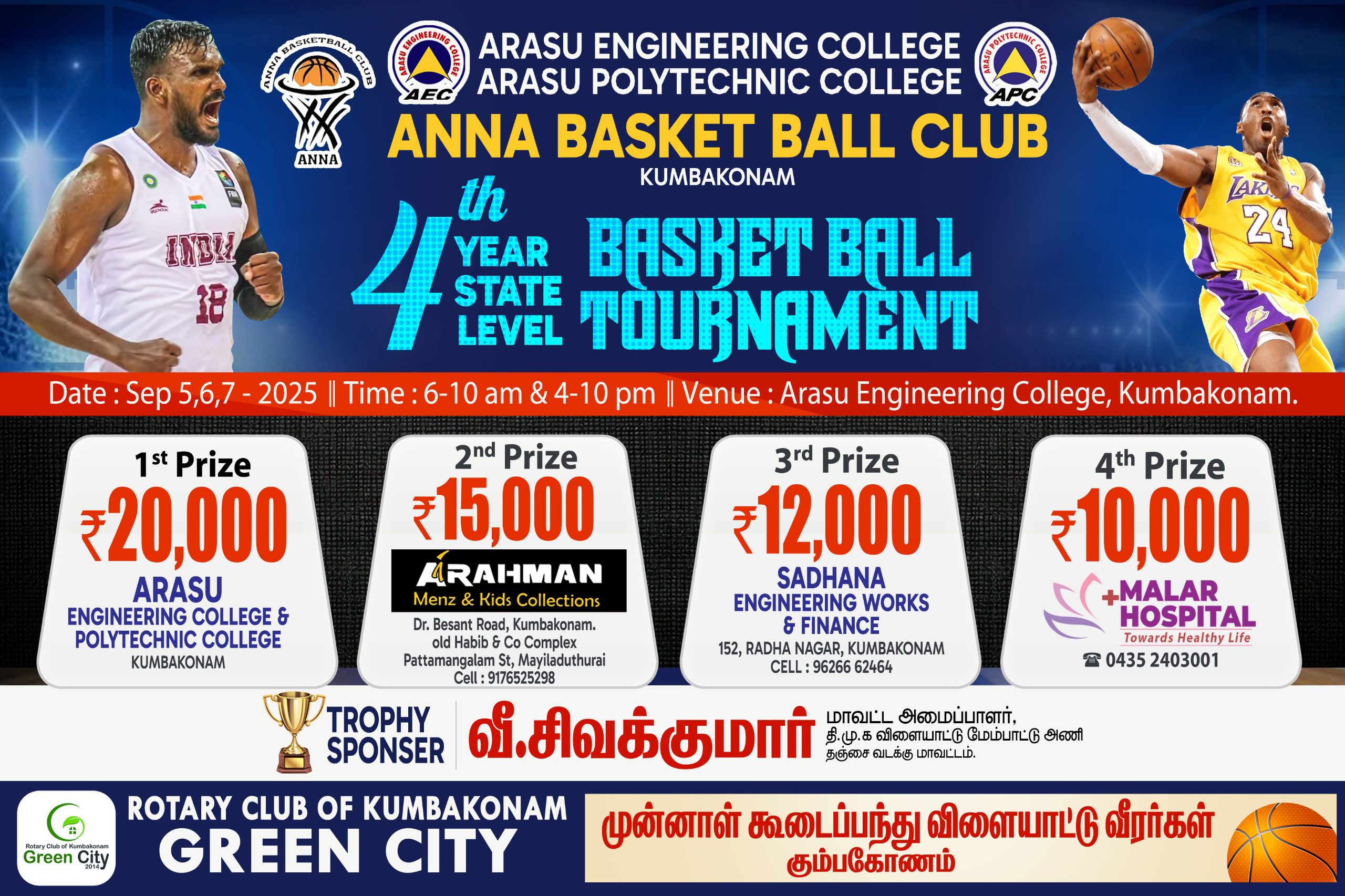 Arasu Engineering College, Arasu Polytechnic College, and Anna Basketball Club Kumbakonam jointly organizes 4th year State level Basketball Tournament from sep 5-7, 2025 @ Arasu Engineering College campus.