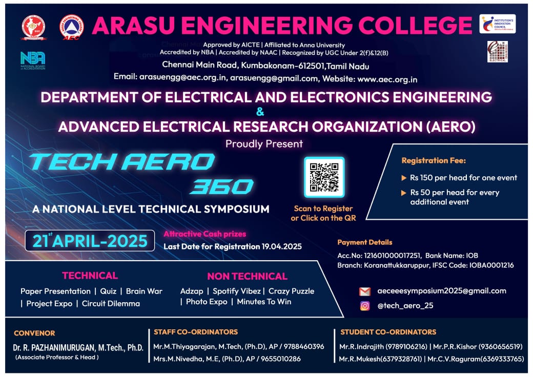Department of EEE has planned to organize a one day National level Technical Symposium “TECH AERO 360▫” on 21-APRIL-2025