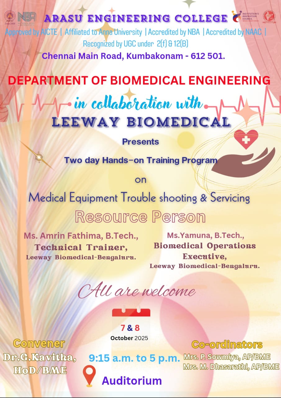 The Department of Biomedical Engineering in collaboration with Leeway Biomedical organizes two day hands on training program on “Medical Equipment Trouble Shooting and Servicing” from 07.10.2025 to 08 .10.2025