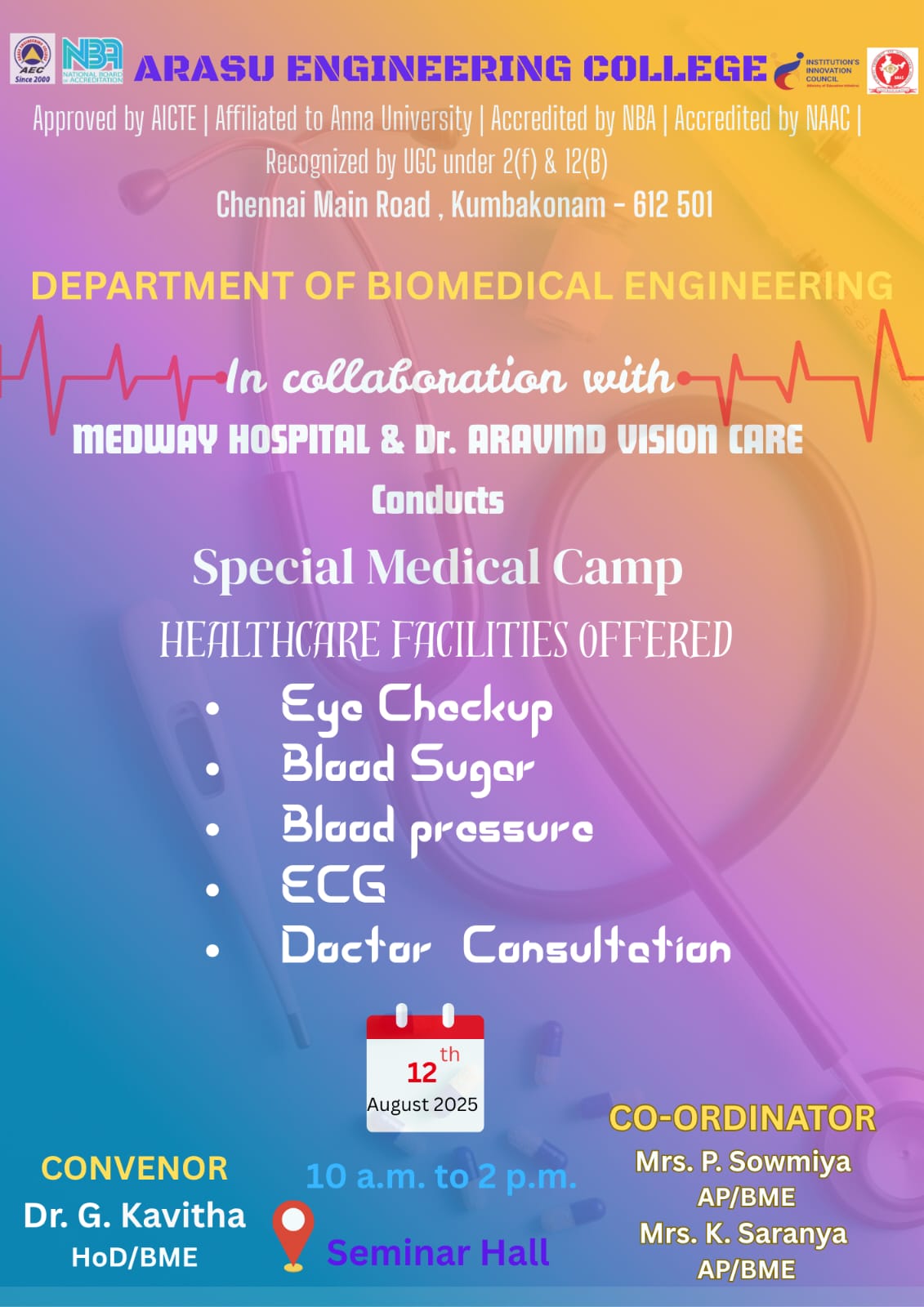 The department of Biomedical Engineering in collaboration with Medway Hospital and Dr.Aravind Vision care conducts Medical Camp on 12.08.25 @ Aec Seminar Hall.