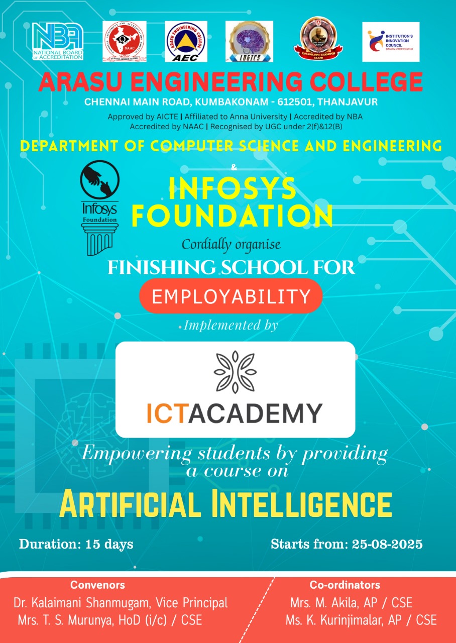 The Department of Computer Science and Engineering, in association with ICT Academy and Infosys Foundation, is organizing a Finishing School for Employability- a certification course on Artificial Intelligence- conducted from 25.08.2025 to 16.09.2025