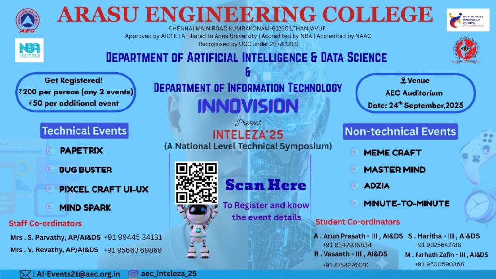 The Departments of Artificial Intelligence and Data Science & Information Technology organizes “INTELLEZA’25” a National level Technical Symposium on 24.09.25.