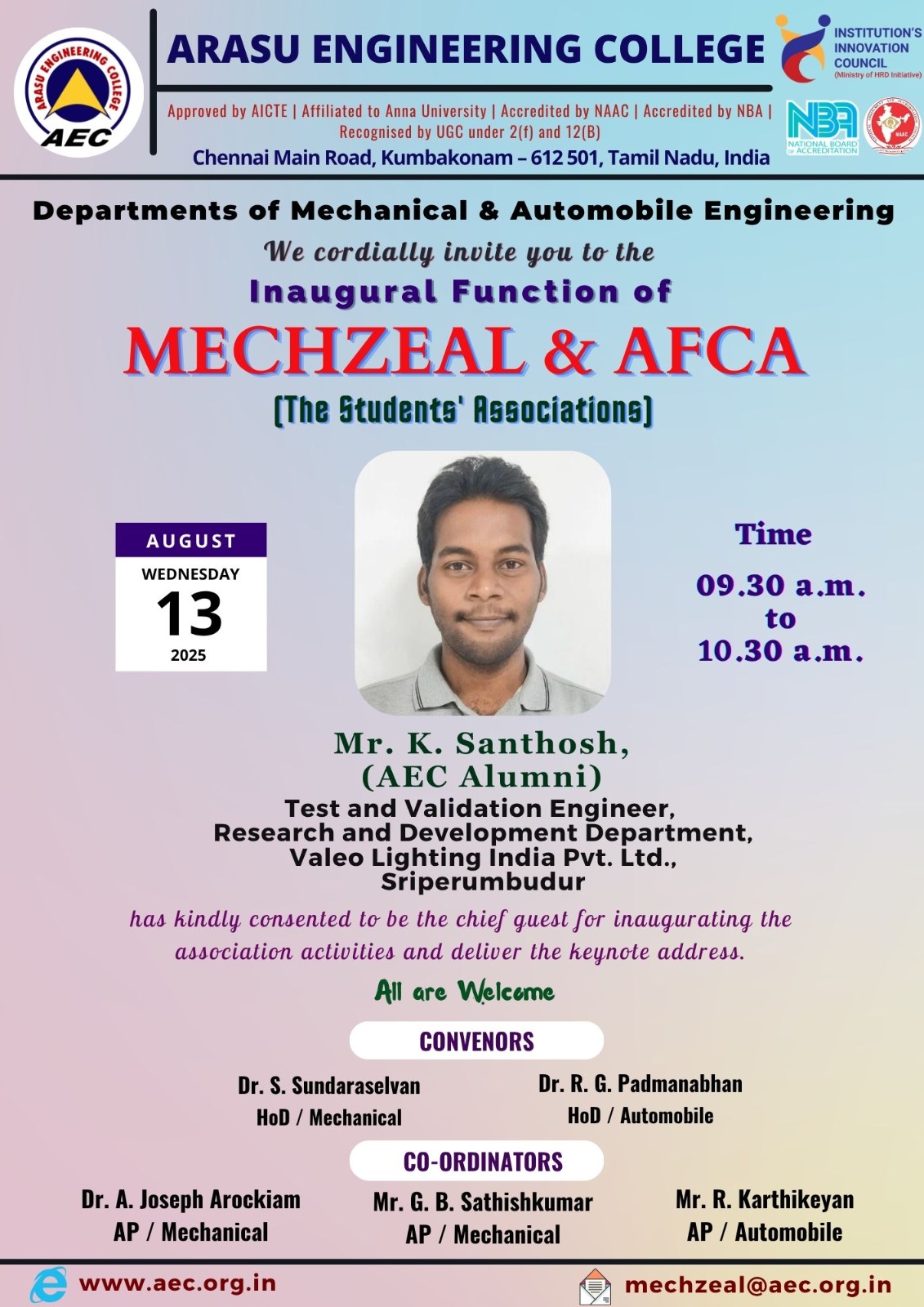 The Departments of Mechanical Engineering and Automobile Engineering organizes the Inaugural function of MECHZEAL & AFCA (The Student’s Associations) on 13.08.25
