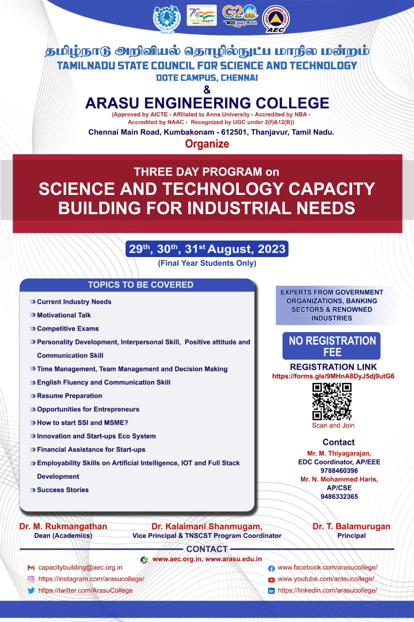 Tamilnadu State Council for Science and Technology DOTE CAMPUS, chennai and Arasu Engineering College, Kumbakonam organize Three day program on “SCIENCE AND TECHNOLOGY CAPACITY BUILDING FOR INDUSTRIAL NEEDS” 29th,30th,31st August, 2023 (Final Year Students Only)